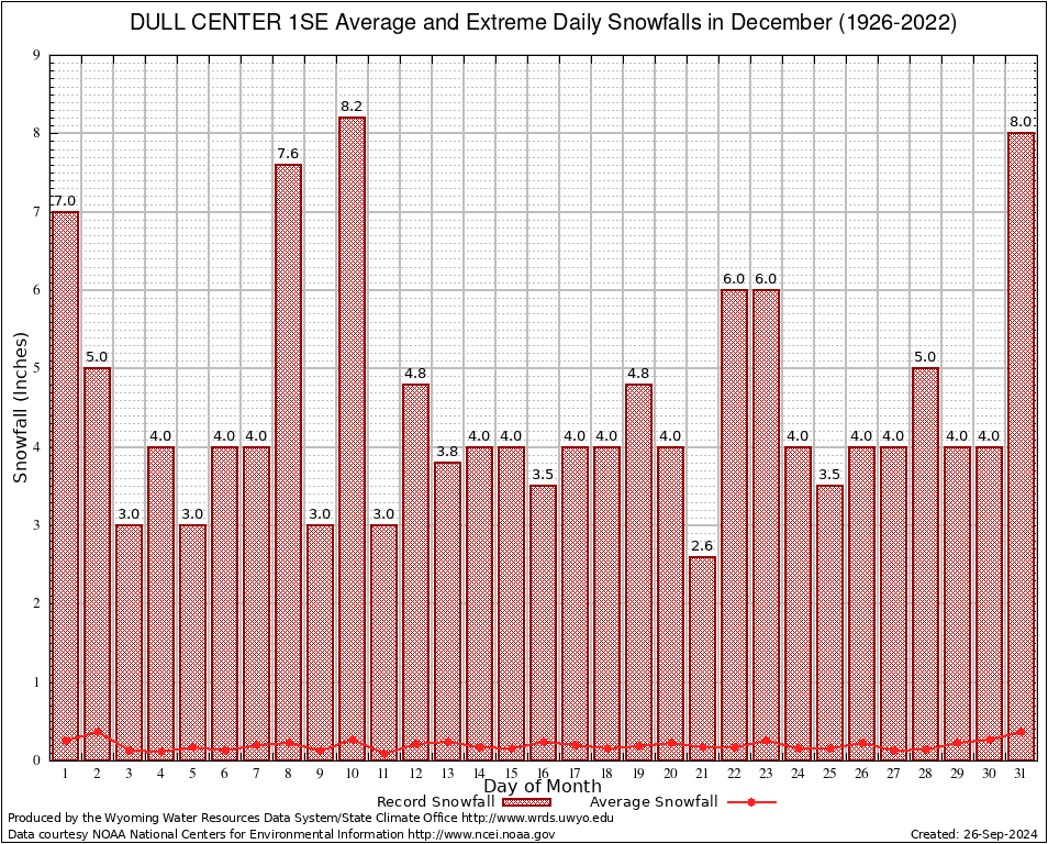 December Average and Extreme Daily Snowfall AMounts (1926-2022)