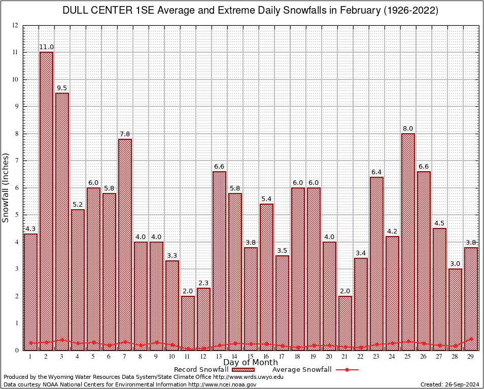 February Average and Extreme Daily Snowfall AMounts (1926-2022)
