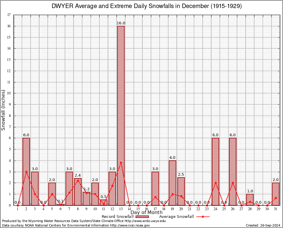 DWYER (482800) December Average and Extreme Daily Snowfall AMounts (1915-1929) To index page for DWYER