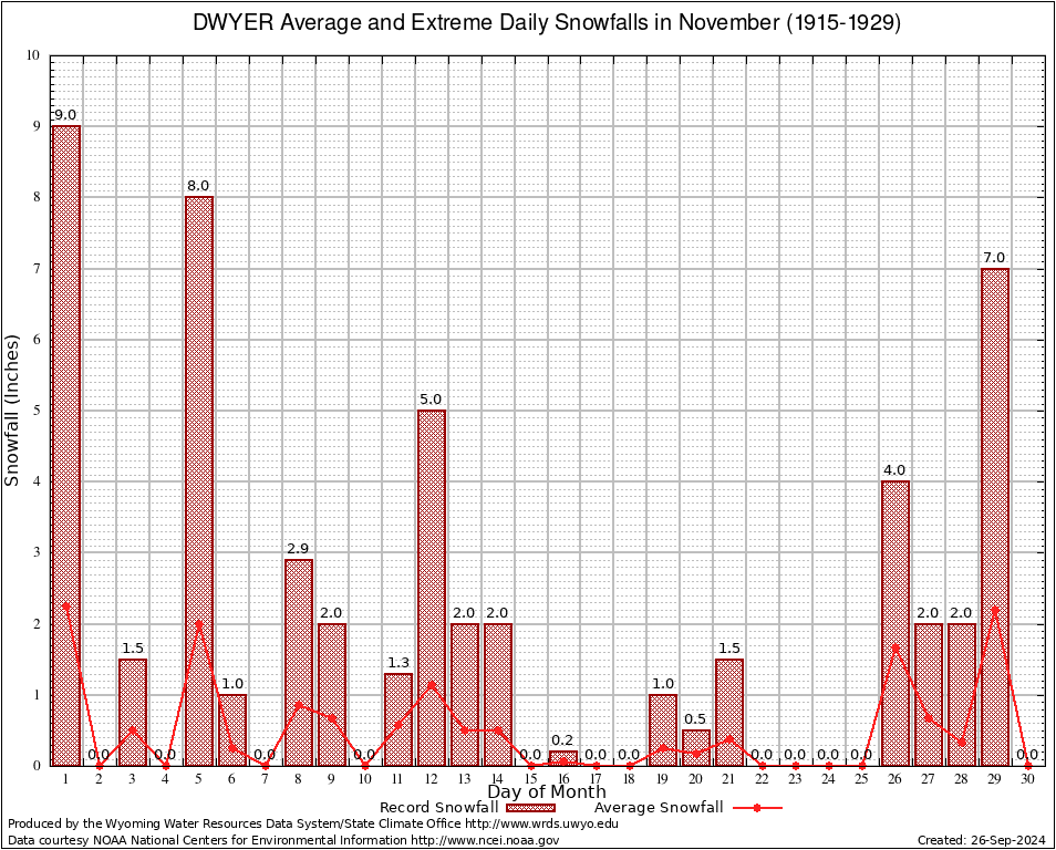 DWYER (482800) November Average and Extreme Daily Snowfall AMounts (1915-1929) To index page for DWYER