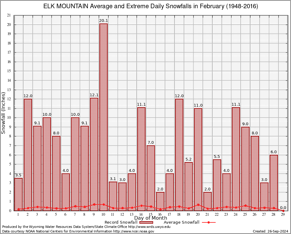February Average and Extreme Daily Snowfall AMounts (1948-2016)