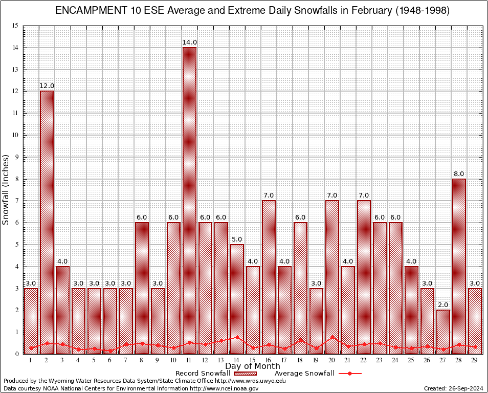 February Average and Extreme Daily Snowfall AMounts (1948-1998)
