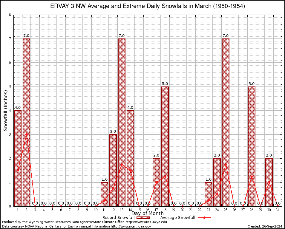 March Average and Extreme Daily Snowfall AMounts (1950-1954)