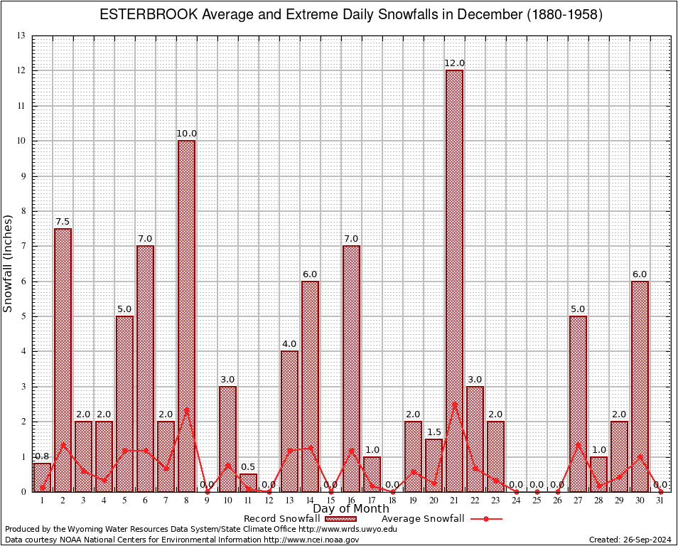 ESTERBROOK (483073) December Average and Extreme Daily Snowfall AMounts (1880-1958) To index page for ESTERBROOK