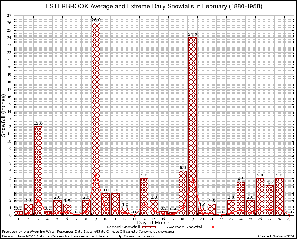 ESTERBROOK (483073) February Average and Extreme Daily Snowfall AMounts (1880-1958) To index page for ESTERBROOK