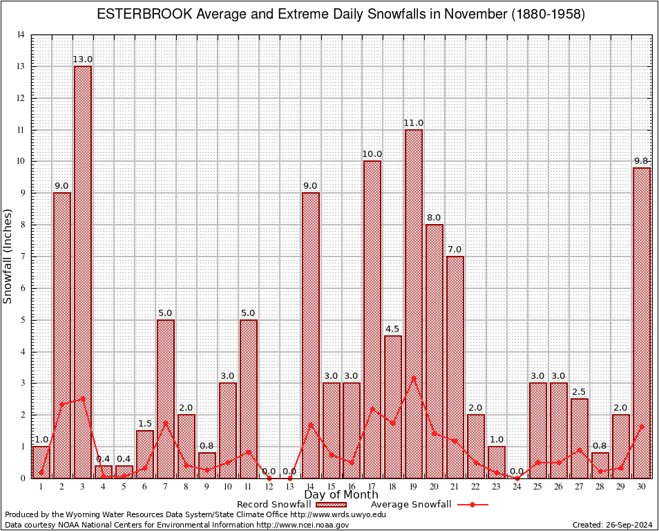ESTERBROOK (483073) November Average and Extreme Daily Snowfall AMounts (1880-1958) To index page for ESTERBROOK