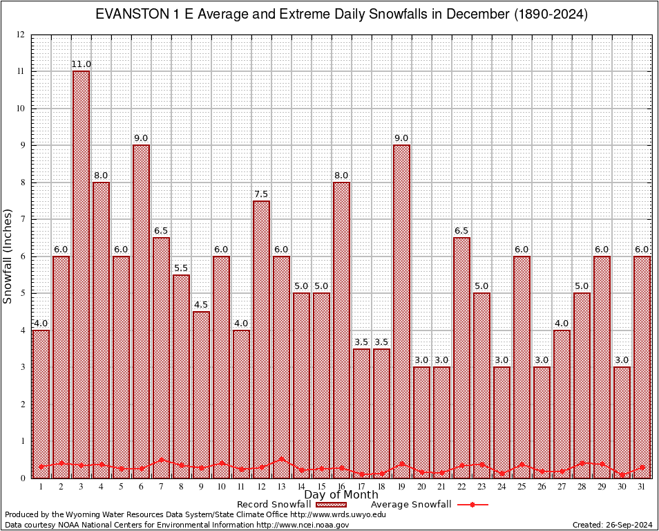 December Average and Extreme Daily Snowfall AMounts (1890-2024)