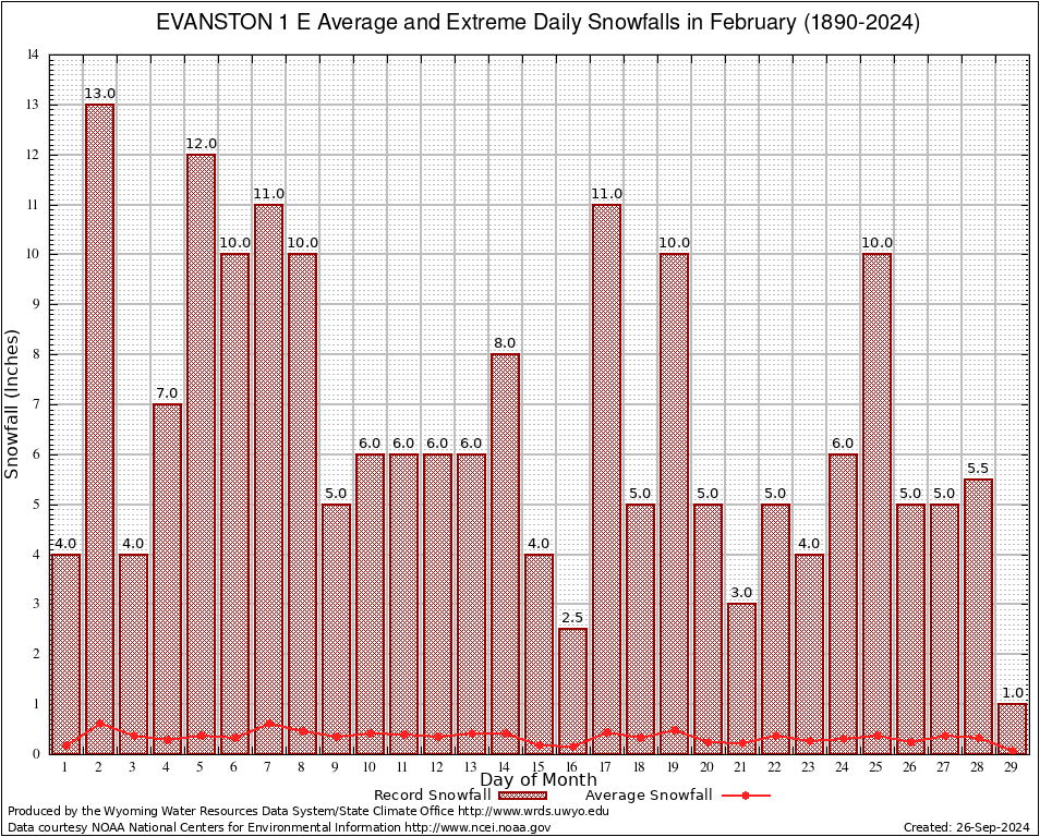 February Average and Extreme Daily Snowfall AMounts (1890-2024)