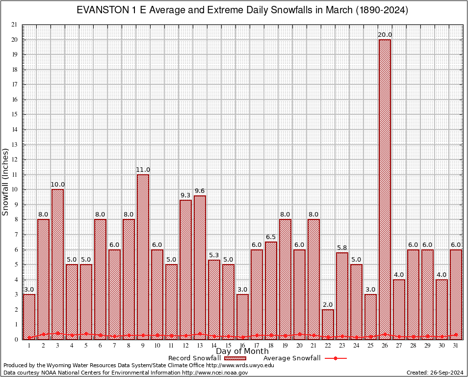 March Average and Extreme Daily Snowfall AMounts (1890-2024)