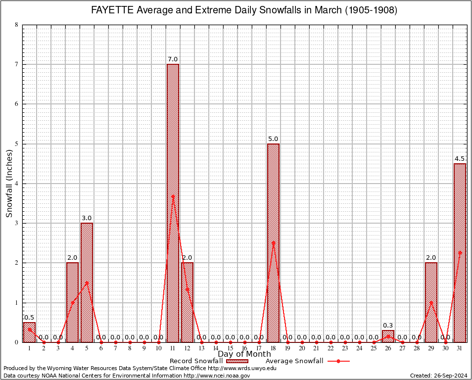 FAYETTE (483210) March Average and Extreme Daily Snowfall AMounts (1905-1908) To index page for FAYETTE