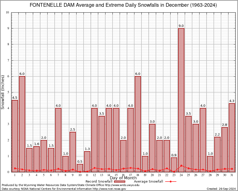 December Average and Extreme Daily Snowfall AMounts (1963-2024)