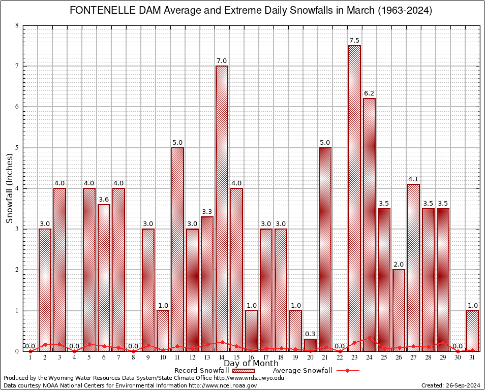 March Average and Extreme Daily Snowfall AMounts (1963-2024)