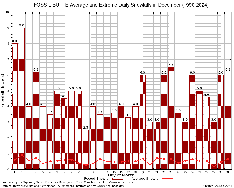 December Average and Extreme Daily Snowfall AMounts (1990-2024)