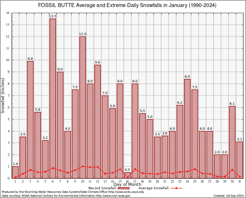 January Average and Extreme Daily Snowfall AMounts (1990-2024)
