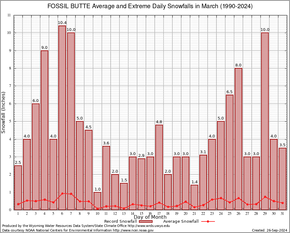 March Average and Extreme Daily Snowfall AMounts (1990-2024)