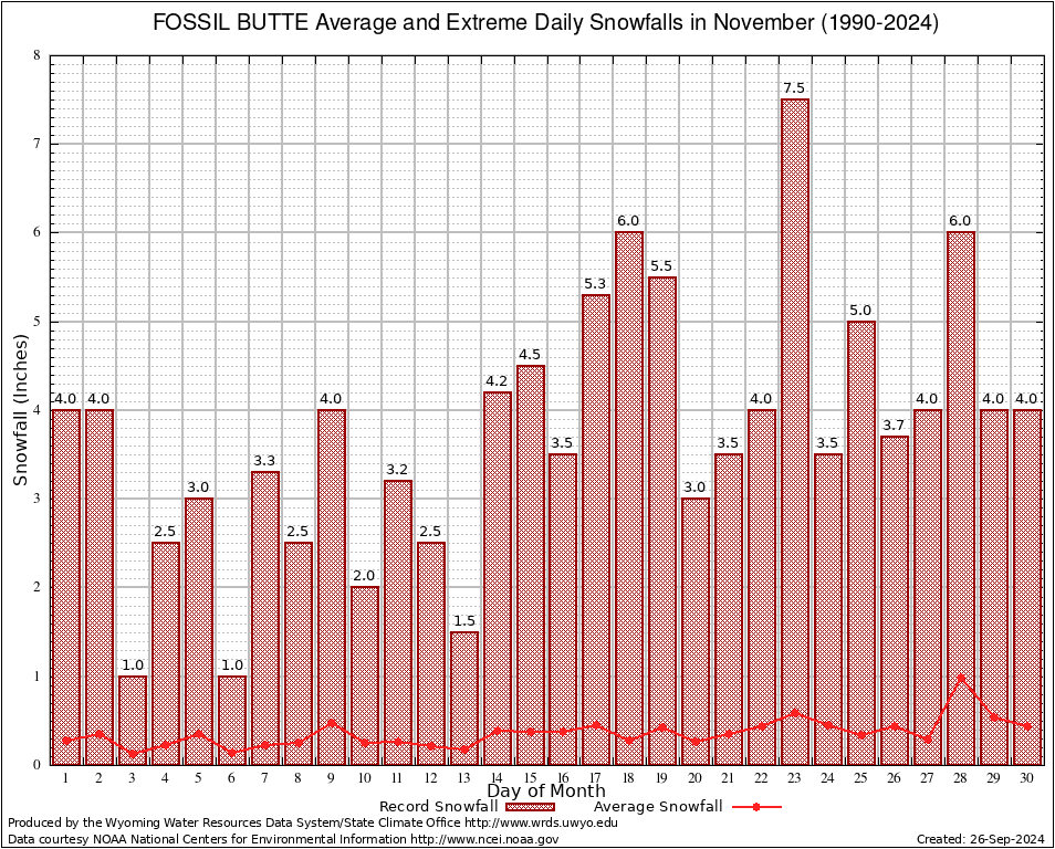 November Average and Extreme Daily Snowfall AMounts (1990-2024)