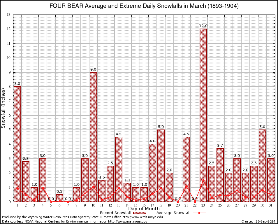 March Average and Extreme Daily Snowfall AMounts (1893-1904)