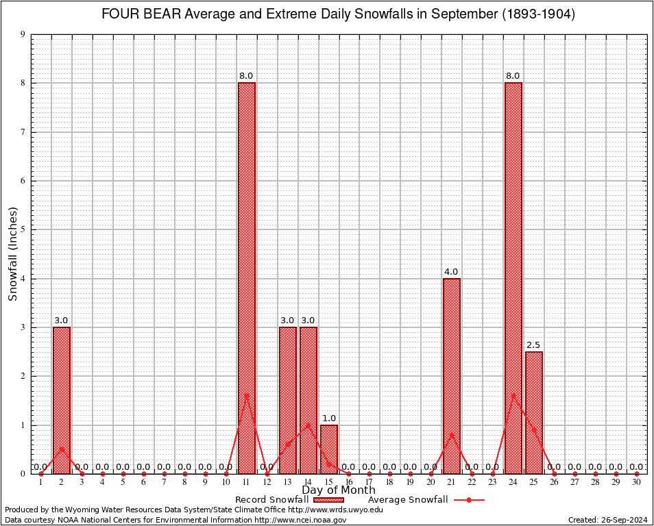 FOUR BEAR (483610) September Average and Extreme Daily Snowfall AMounts (1893-1904) To index page for FOUR BEAR