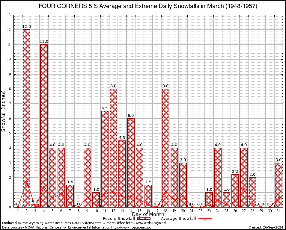 March Average and Extreme Daily Snowfall AMounts (1948-1957)