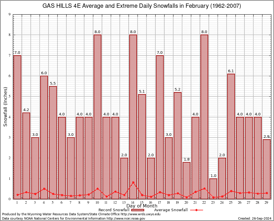 February Average and Extreme Daily Snowfall AMounts (1962-2007)