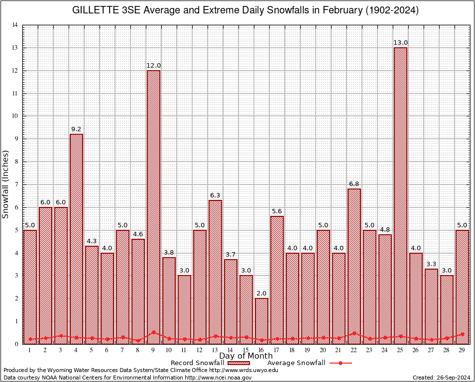 February Average and Extreme Daily Snowfall AMounts (1902-2024)