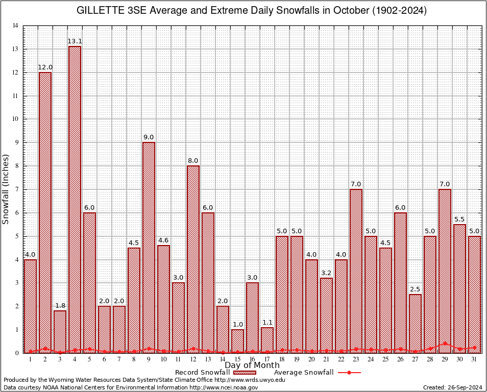 October Average and Extreme Daily Snowfall AMounts (1902-2024)