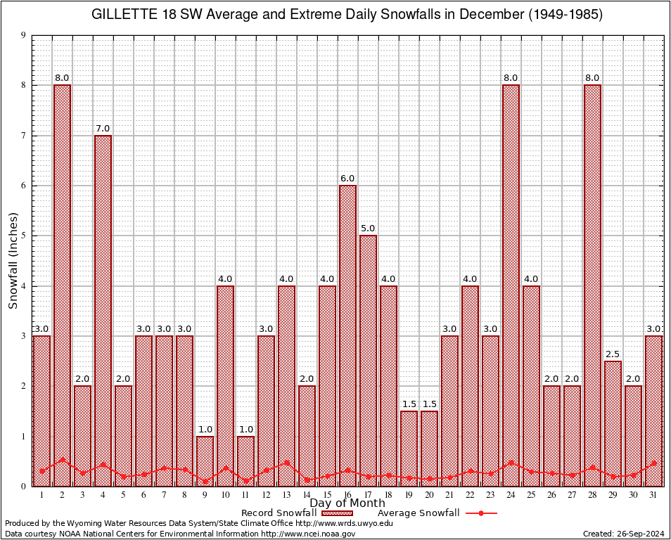 December Average and Extreme Daily Snowfall AMounts (1949-1985)