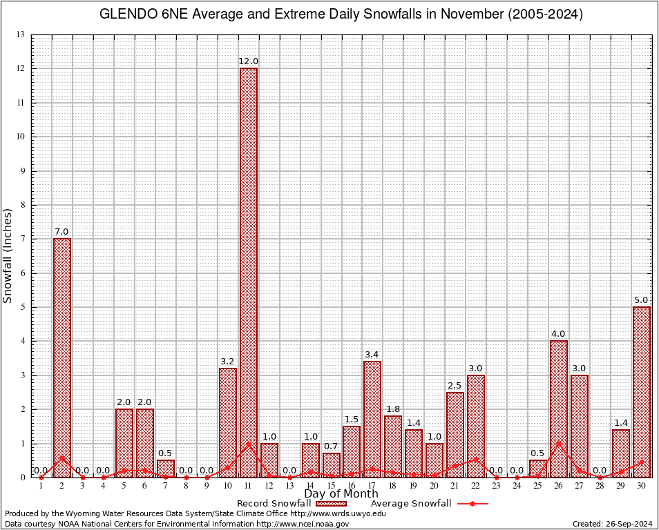GLENDO 6NE (483936) November Average and Extreme Daily Snowfall AMounts (2005-2024) To index page for GLENDO 6NE