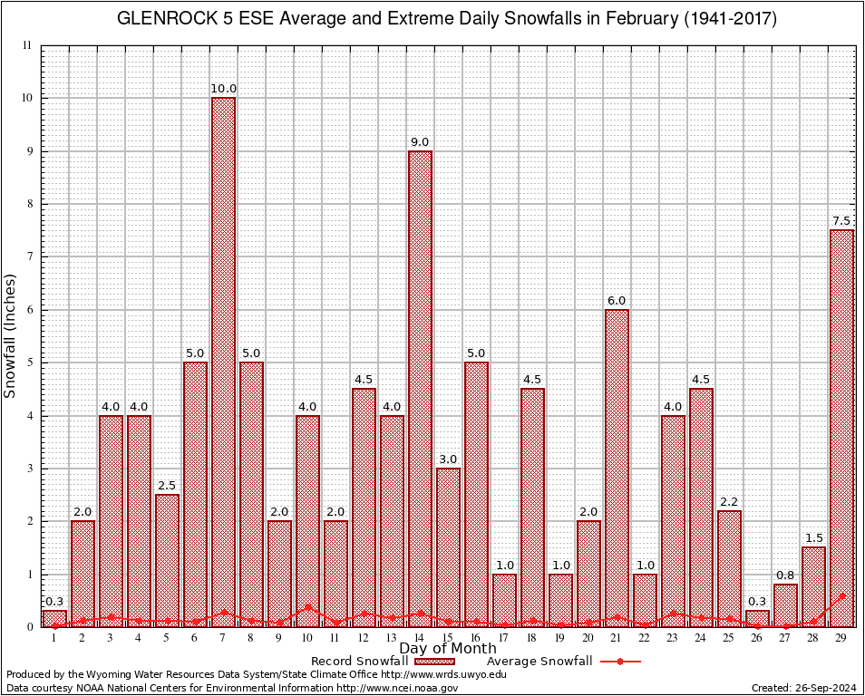 February Average and Extreme Daily Snowfall AMounts (1941-2017)