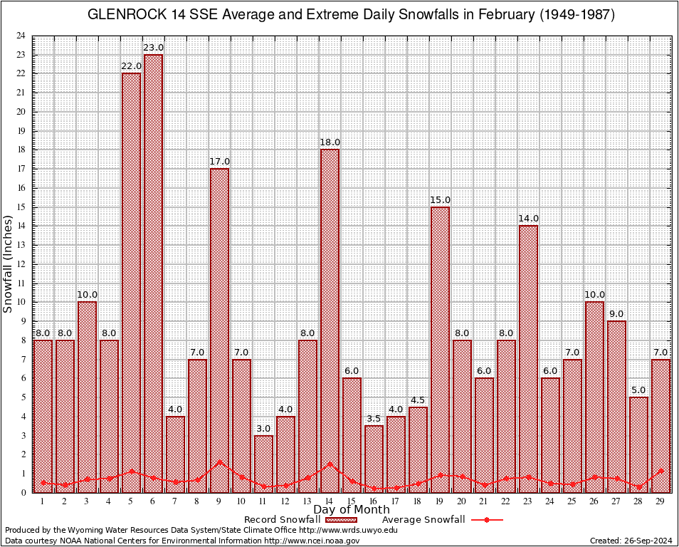 February Average and Extreme Daily Snowfall AMounts (1949-1987)