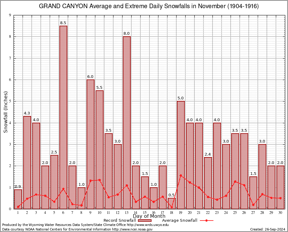 November Average and Extreme Daily Snowfall AMounts (1904-1916)