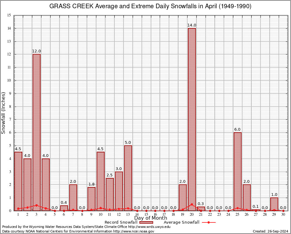 April Average and Extreme Daily Snowfall AMounts (1949-1990)