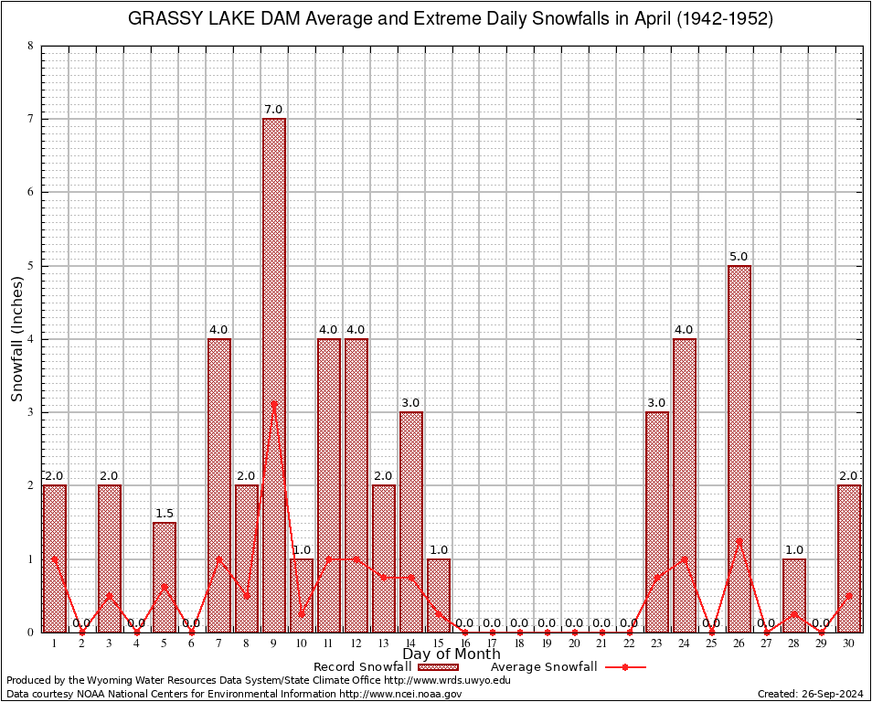 April Average and Extreme Daily Snowfall AMounts (1942-1952)