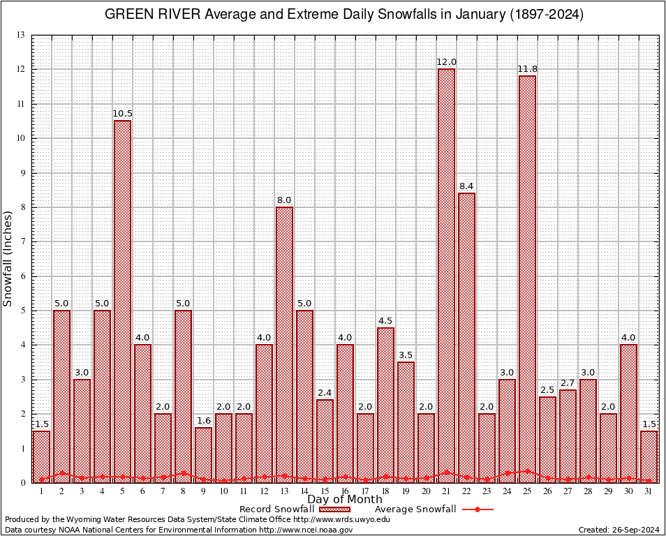January Average and Extreme Daily Snowfall AMounts (1897-2024)