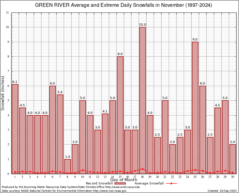 November Average and Extreme Daily Snowfall AMounts (1897-2024)