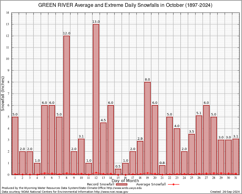 October Average and Extreme Daily Snowfall AMounts (1897-2024)