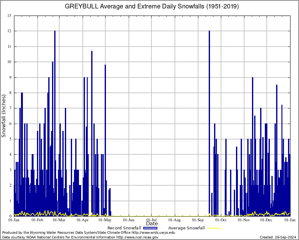 GREYBULL (484080) Annual Average and Extreme Daily Snowfall AMounts (1951-2019) To index page for GREYBULL