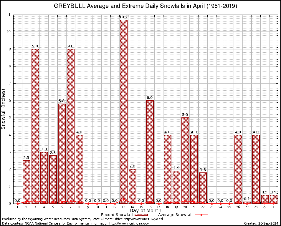 GREYBULL (484080) April Average and Extreme Daily Snowfall AMounts (1951-2019) To index page for GREYBULL