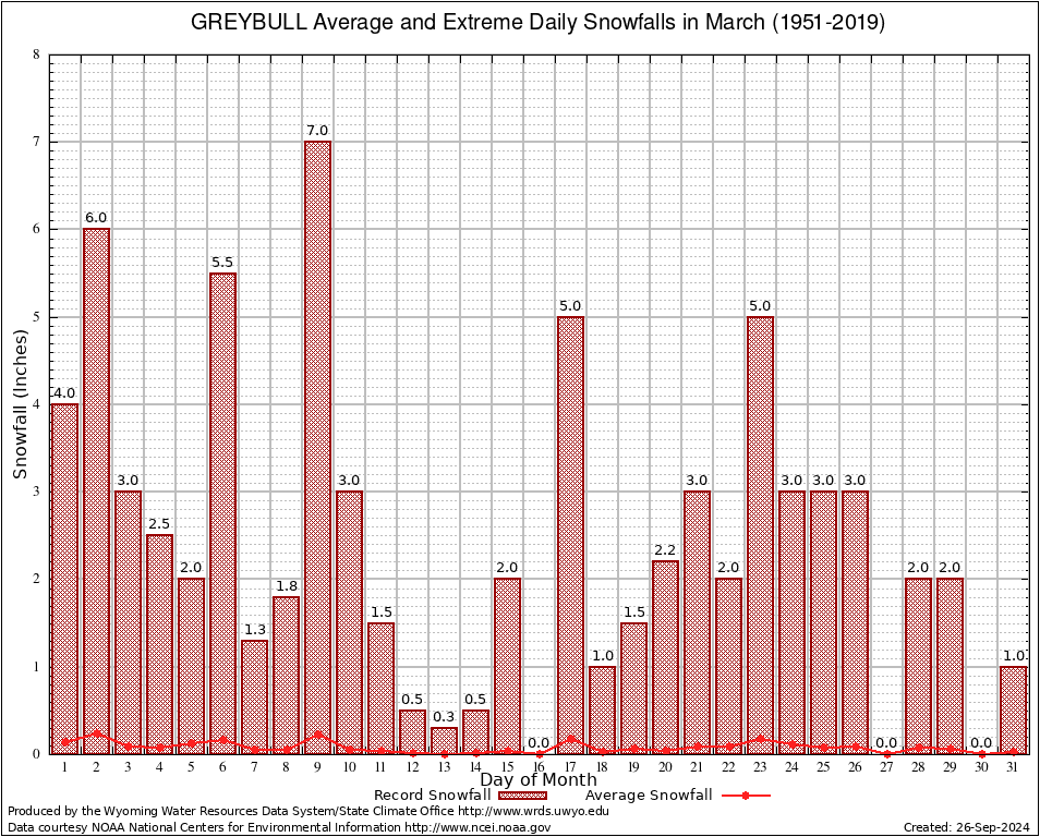 GREYBULL (484080) March Average and Extreme Daily Snowfall AMounts (1951-2019) To index page for GREYBULL