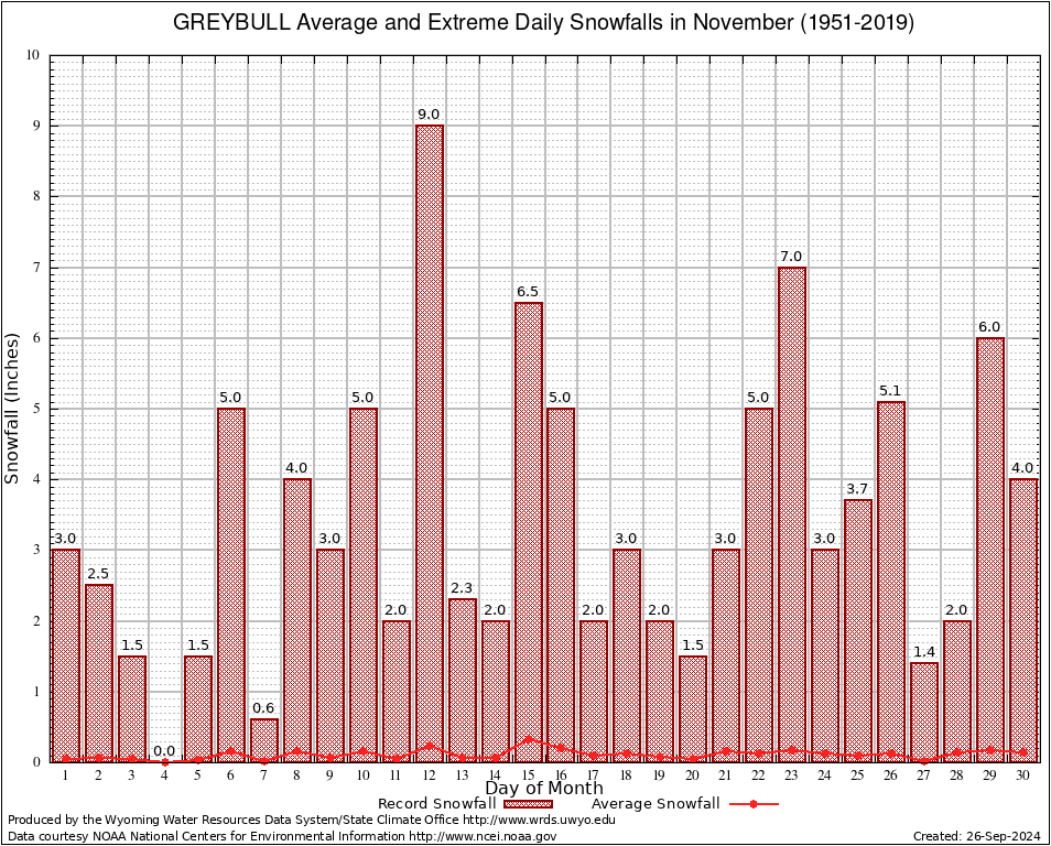 GREYBULL (484080) November Average and Extreme Daily Snowfall AMounts (1951-2019) To index page for GREYBULL