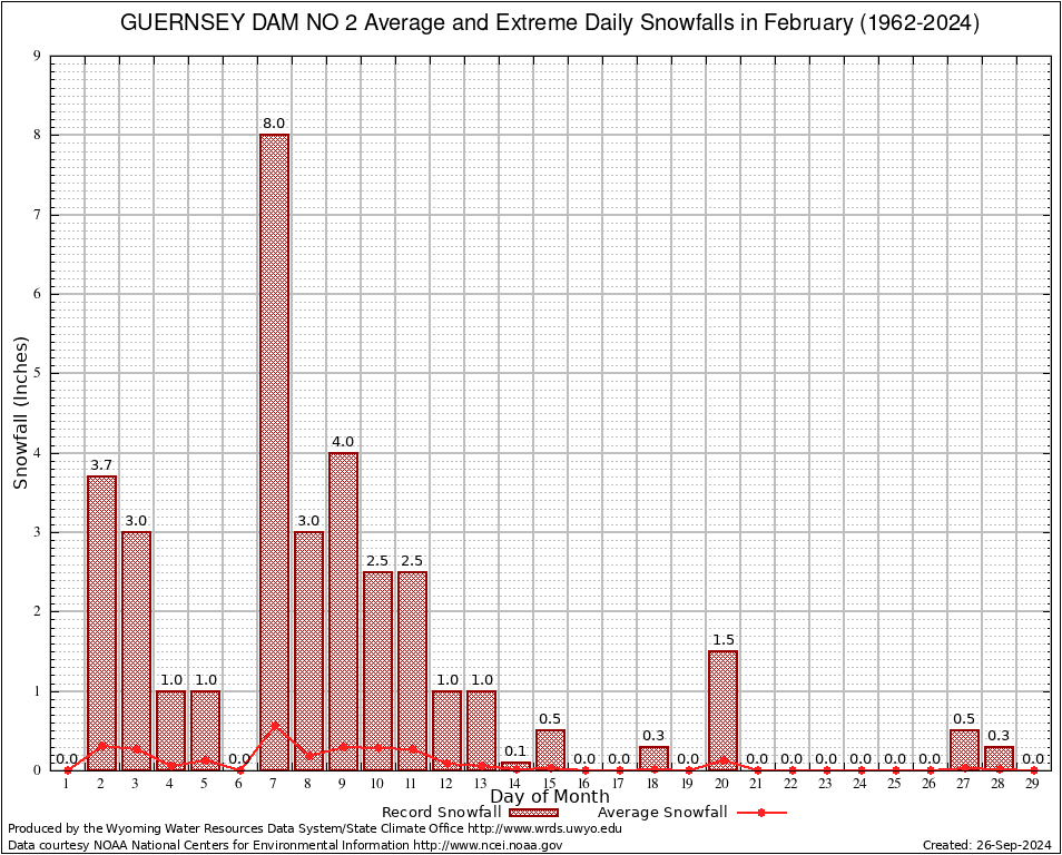 February Average and Extreme Daily Snowfall AMounts (1962-2024)