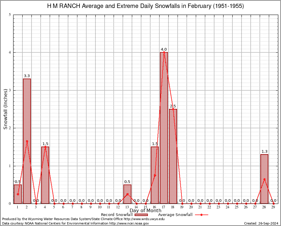 H M RANCH (484169) February Average and Extreme Daily Snowfall AMounts (1951-1955) To index page for H M RANCH