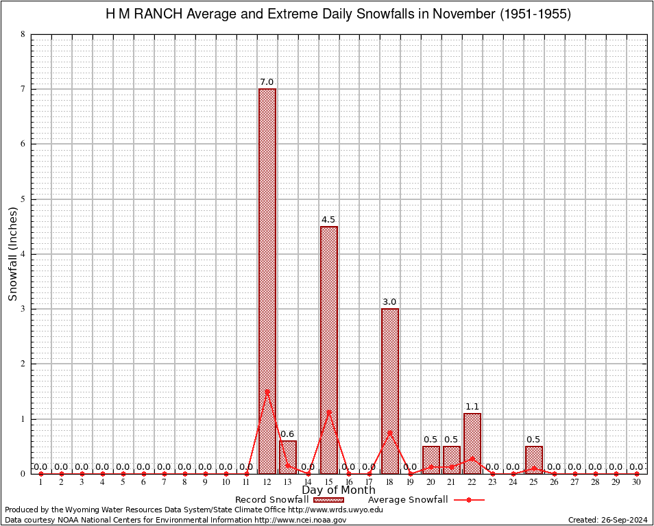 H M RANCH (484169) November Average and Extreme Daily Snowfall AMounts (1951-1955) To index page for H M RANCH