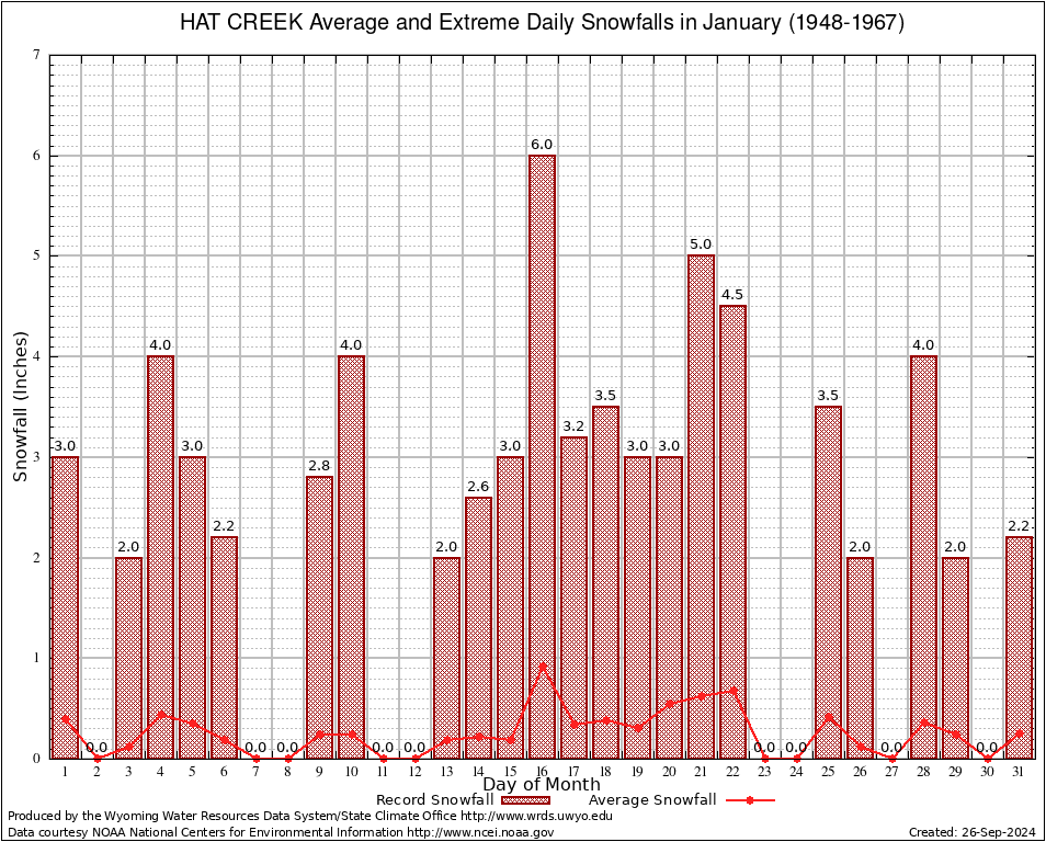 HAT CREEK (484300) January Average and Extreme Daily Snowfall AMounts (1948-1967) To index page for HAT CREEK