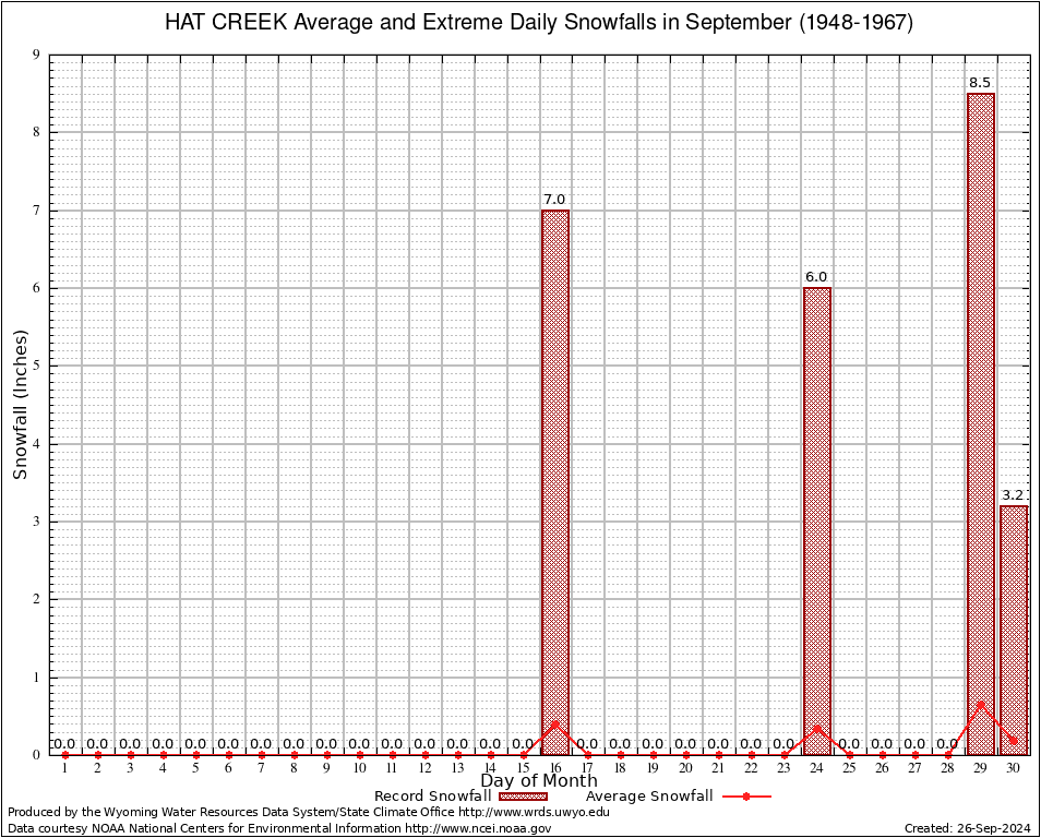 HAT CREEK (484300) September Average and Extreme Daily Snowfall AMounts (1948-1967) To index page for HAT CREEK