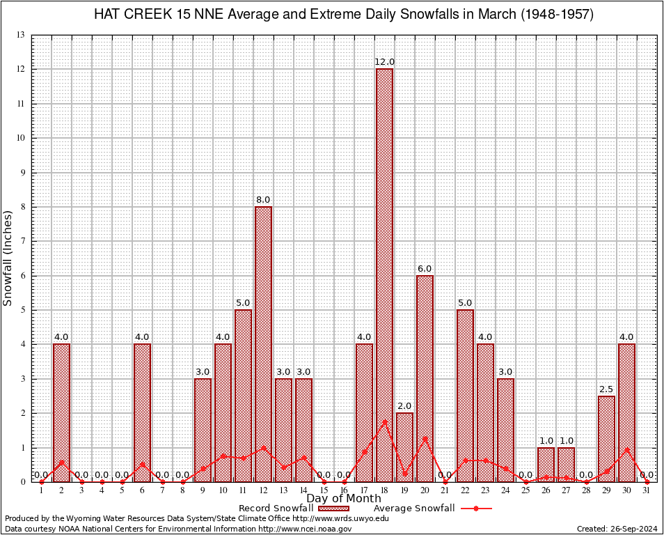 March Average and Extreme Daily Snowfall AMounts (1948-1957)