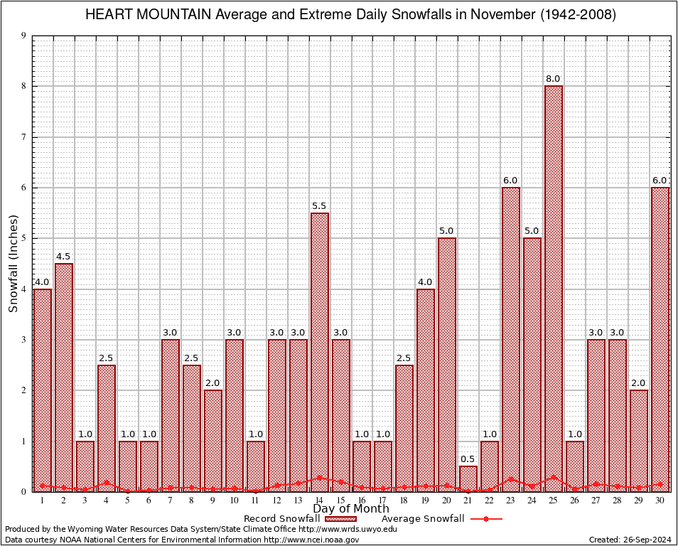 November Average and Extreme Daily Snowfall AMounts (1942-2008)