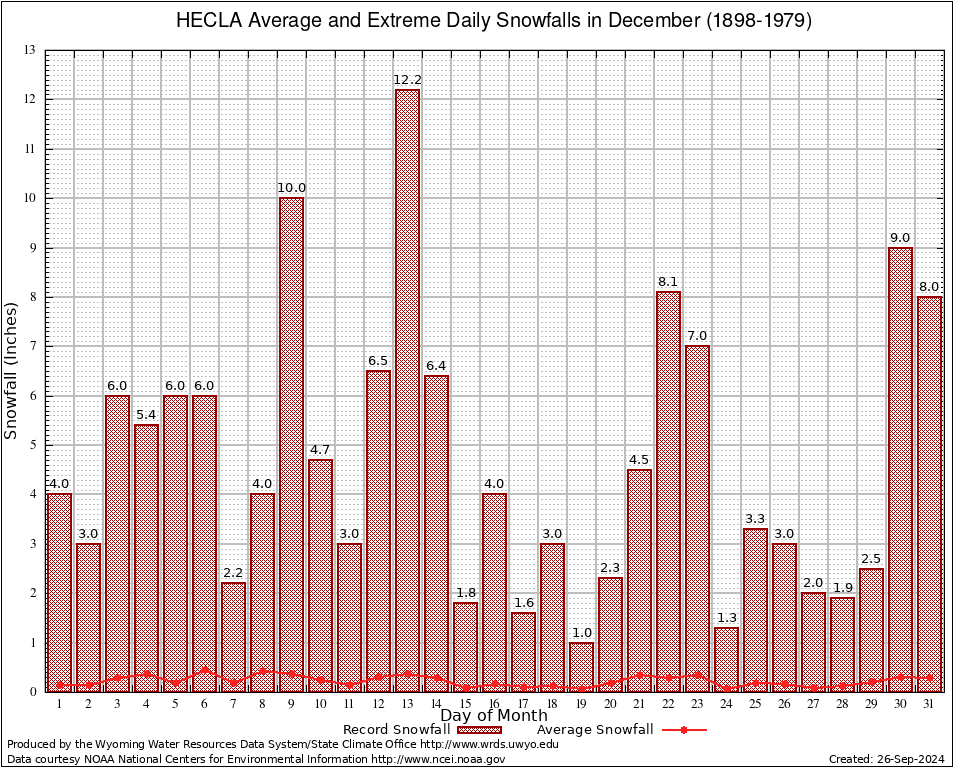 HECLA (484440) December Average and Extreme Daily Snowfall AMounts (1898-1979) To index page for HECLA