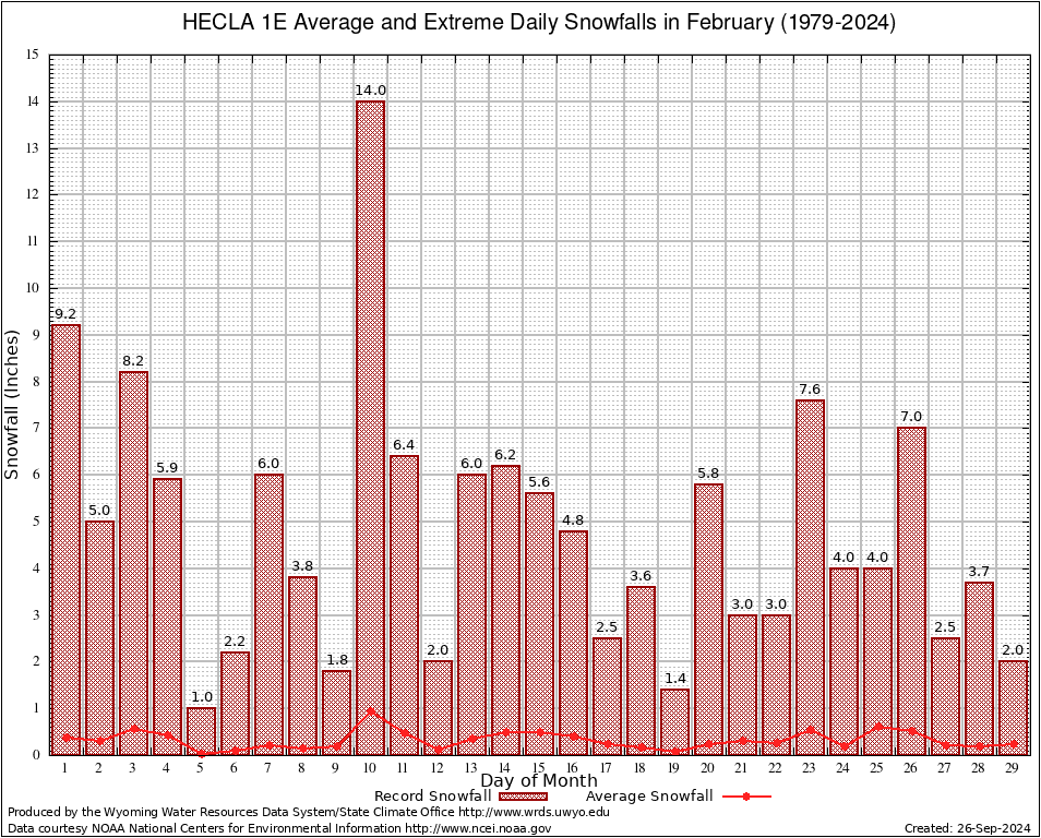 HECLA 1E (484442) February Average and Extreme Daily Snowfall AMounts (1979-2024) To index page for HECLA 1E