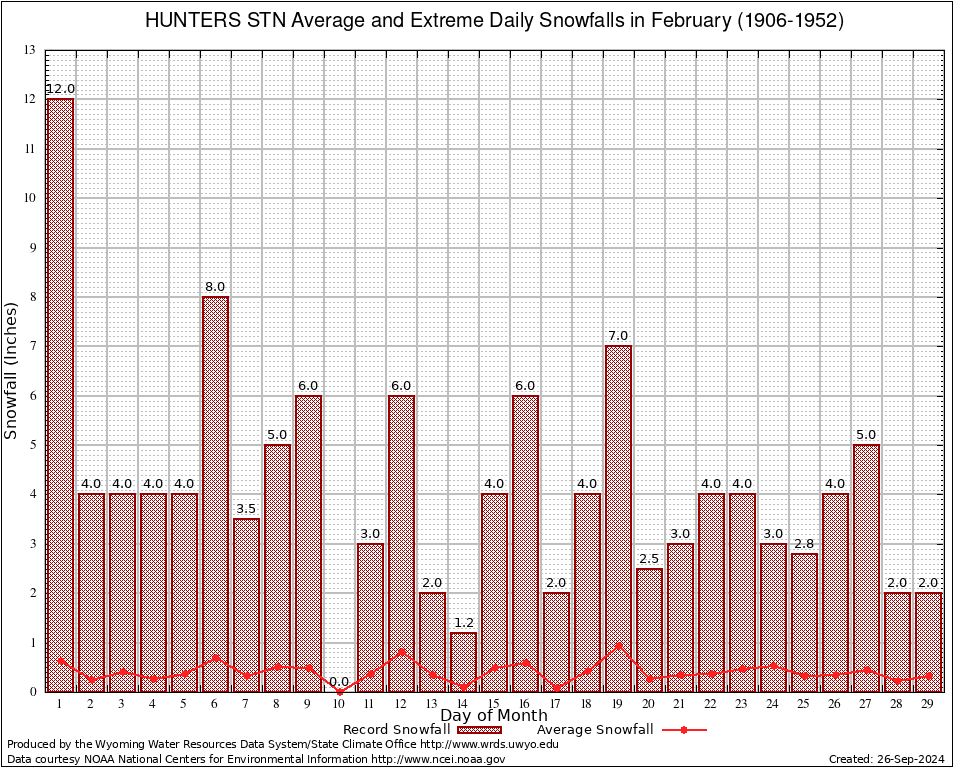 February Average and Extreme Daily Snowfall AMounts (1906-1952)